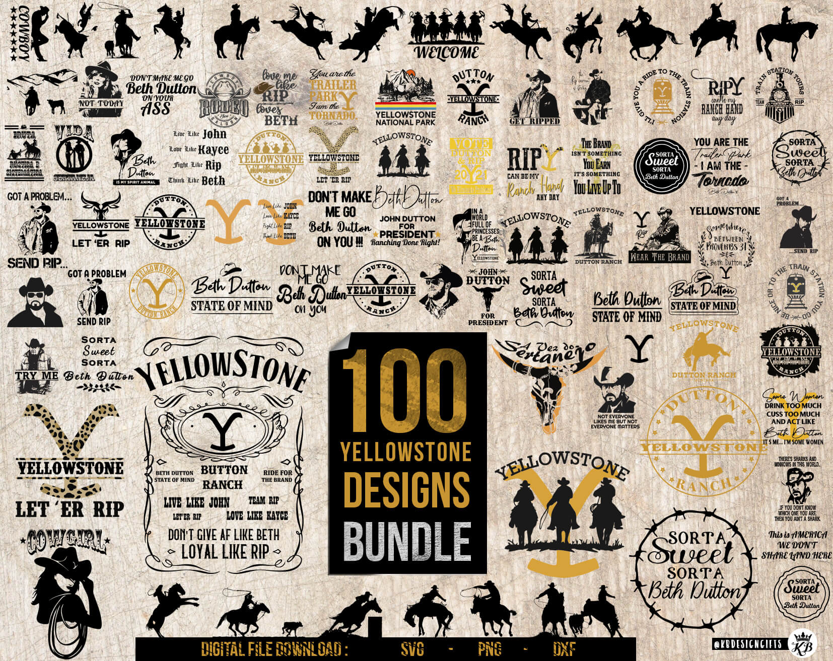 Unleash your creativity with this Yellowstone SVG Bundle, featuring 100 unique designs inspired by the popular Dutton Ranch series. This pack includes western-style graphics, Beth Dutton SVG quotes, Rip Wheeler designs, cowboy silhouettes, and classic Yellowstone ranch logos perfect for every craft lover.